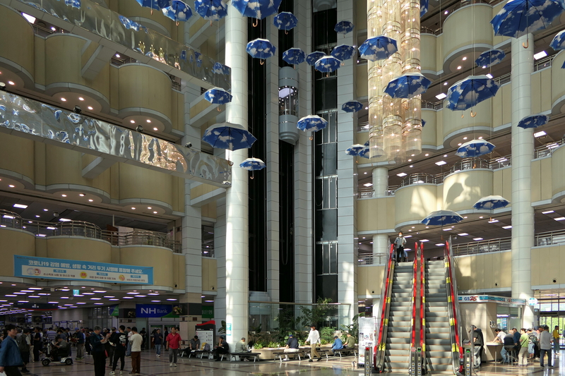 - Foyer of the grandstand with escalators, glass elevators and umbrellas as an art installation