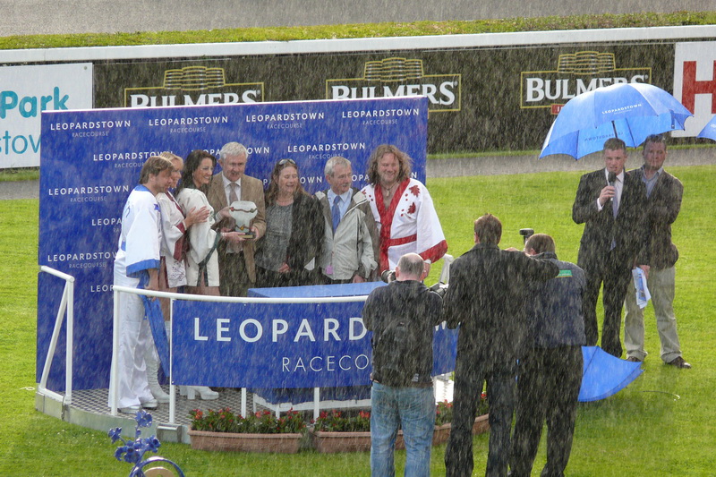 Teilnehmer der Siegerehrung und Medienvertreter trotzen dem typisch irischen Wetter